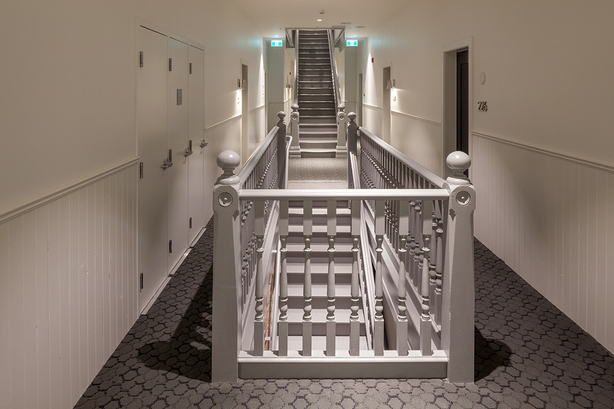 The 1891 building has been renovated with a series of micro suites. An attached extension houses a rooftop amenity room and more micro suites.