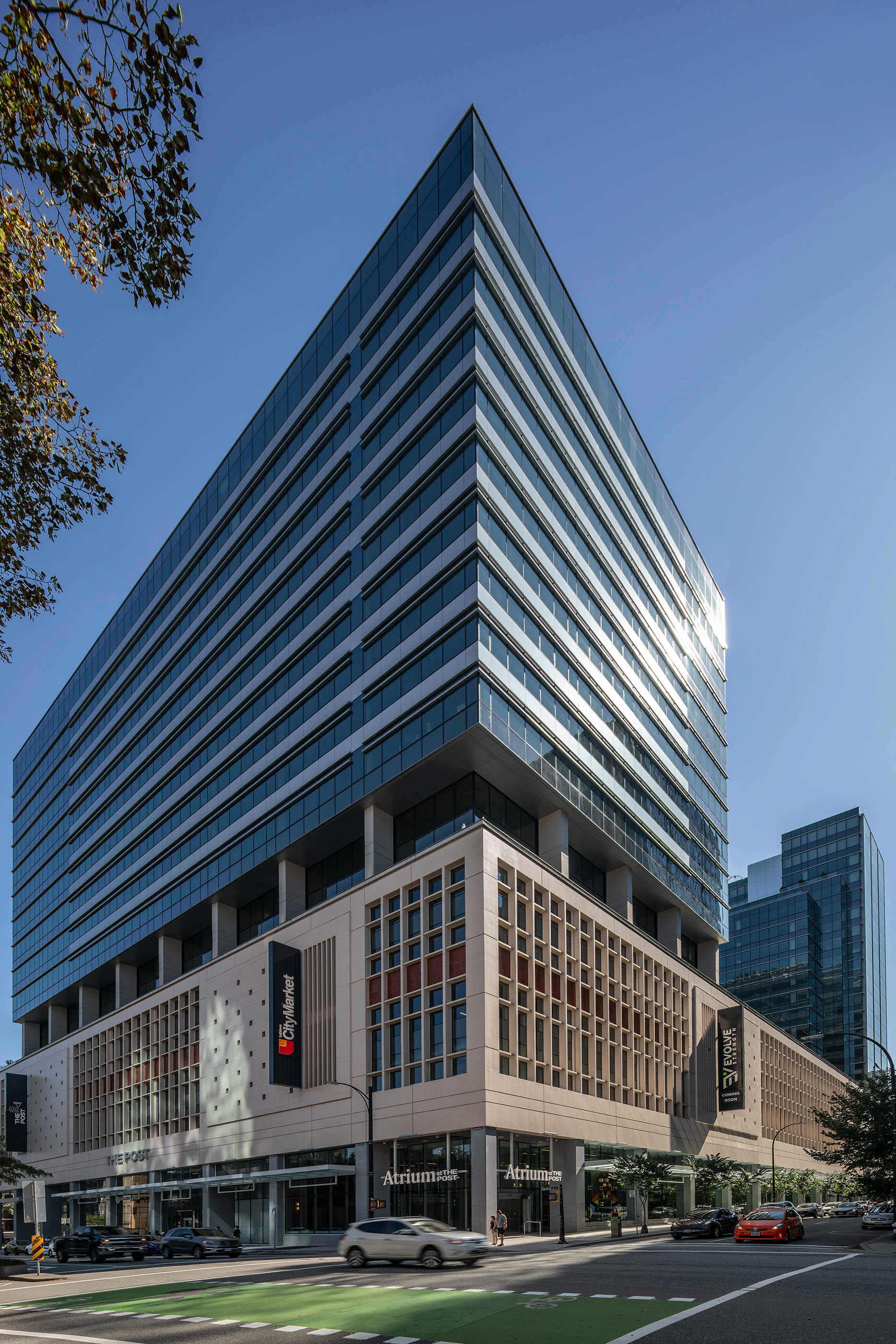 The renovations introduced restaurants, retail spaces on four floors and a new public plaza, as well as two new towers. The designers are MCM Partnership Architects for the QuadReal Property Group. Most of the original building’s stone and decorative features have been restored and retained. Each elevation has distinct window detailing and solar shades.