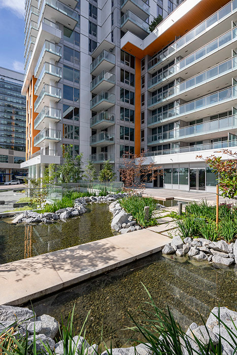 514 market residential units in two towers: one at 27 storeys (235 ft.), with a 7 storey podium, and one at 21 storeys (185 ft.), with a 6 storey podium; 70 market rental units and a 37 space daycare in a 6.5 storey mid-rise; a FSR (floor space ratio) of 4.27.
